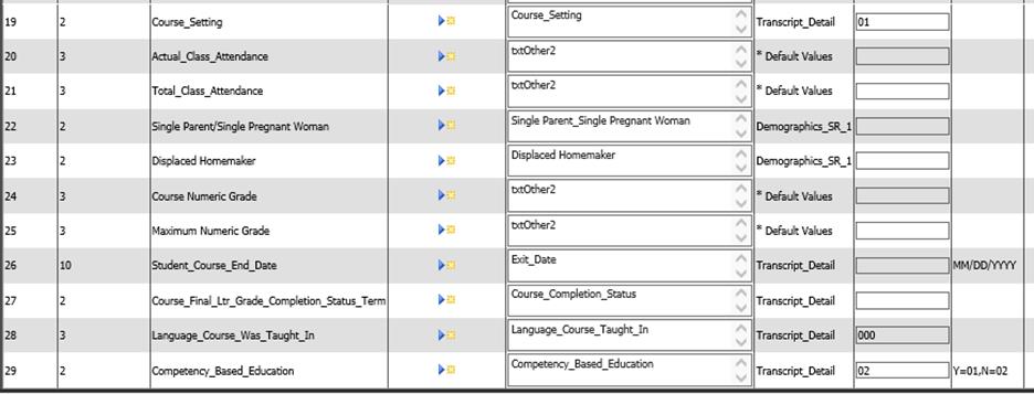o Exit_Date (the last date of the last term the class meets as transcript Exit Date unless the student has an earlier Exit Date in Schedules) This date will fill in automatically from the transcript table once a final grade is awarded, so there is no need to put a date in “Default if blank”. Note: There should NOT be an exit date in the “Default if blank” when submitting courses at the start of the term, before final grades/course completion status is determined. Submitting courses at start of semester with an exit date will cause an error because any course with an exit date is expected to have a final grade, course completion status.