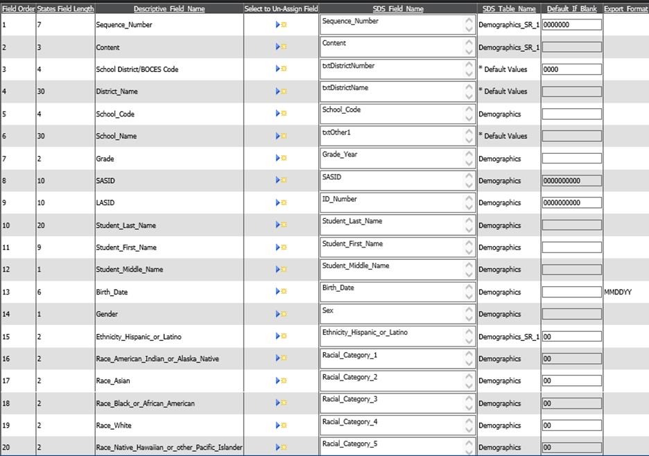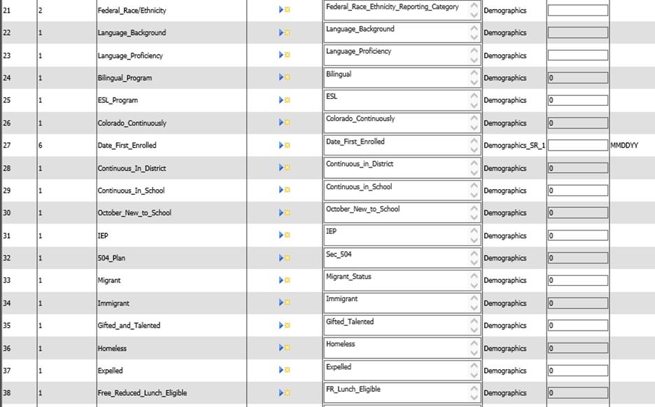 15. Ethnicity – This field indicates if the student is Hispanic/Latino. Field values are 0=No and 1=Yes. Set up a field in demographics, demographics_sr1 or demographics_sr2 to enter this value.