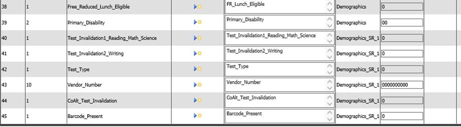 44. CoAlt Test Invalidation - This field only applies to CoAlt Assessments. Check with CDE for code values. Set up a field in demographics, demographics_sr1 or demographics_sr2 to enter appropriate value.