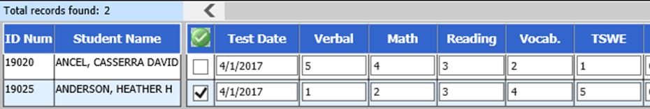 Prior to adding test scores in this area, test score definitions should be set up in the Data Entry & Changes Master File and Code File Entry area. For instructions on setting up test score definitions,